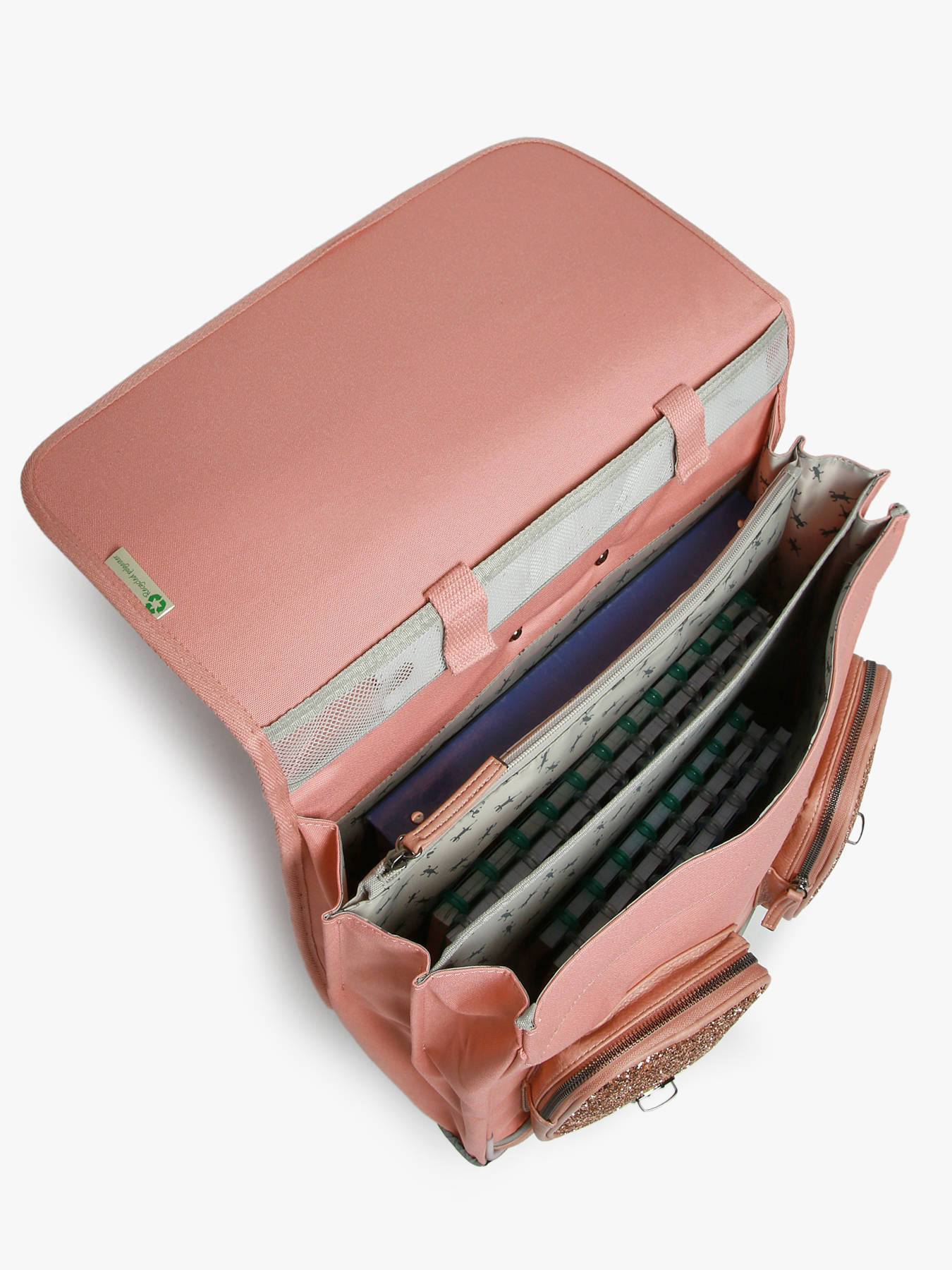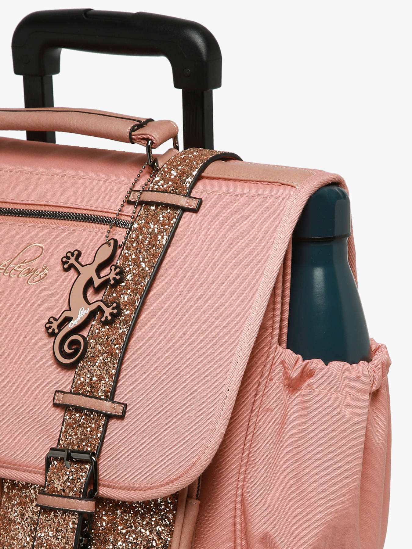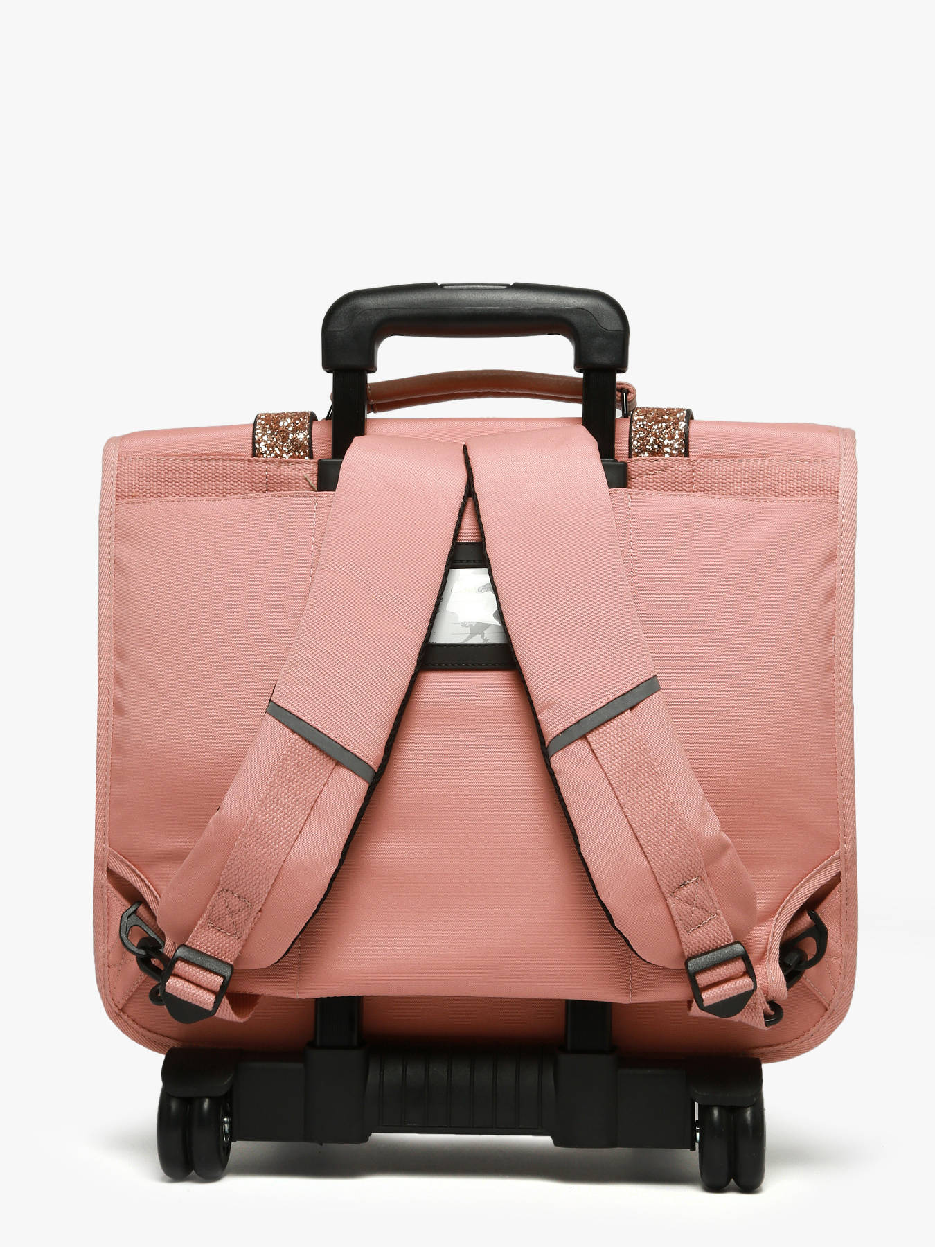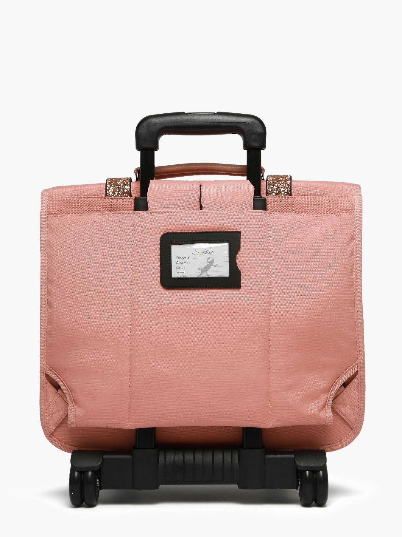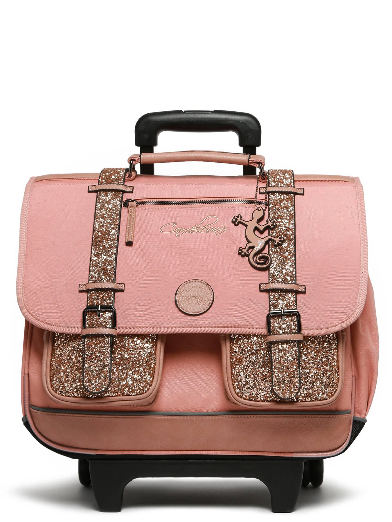 41 cm - 31 liters - 2.6 kg ~ This 41 cm, 3-compartment wheeled school bag from the Vintage Fantasy line by Caméléon is perfect for CM1 and CM2 students. Loved for its large storage capacity, it features three compartments that can hold notebooks and binders up to 32x29x7 cm, along with an interior zipped pocket. On the outside, it includes two front zippered pockets and a side bottle holder. A reflective strip on the front ensures your child’s safety. The bottom and sides are reinforced for daily use. It can also be worn as a backpack thanks to the detachable shoulder straps stored in the back pocket and the padded protection over the wheel frame to protect your child's back. For optimal support, the shoulder straps and back are padded. As a bonus, this school bag includes a name tag, a free ruler, and a fun chameleon keychain on the handle !