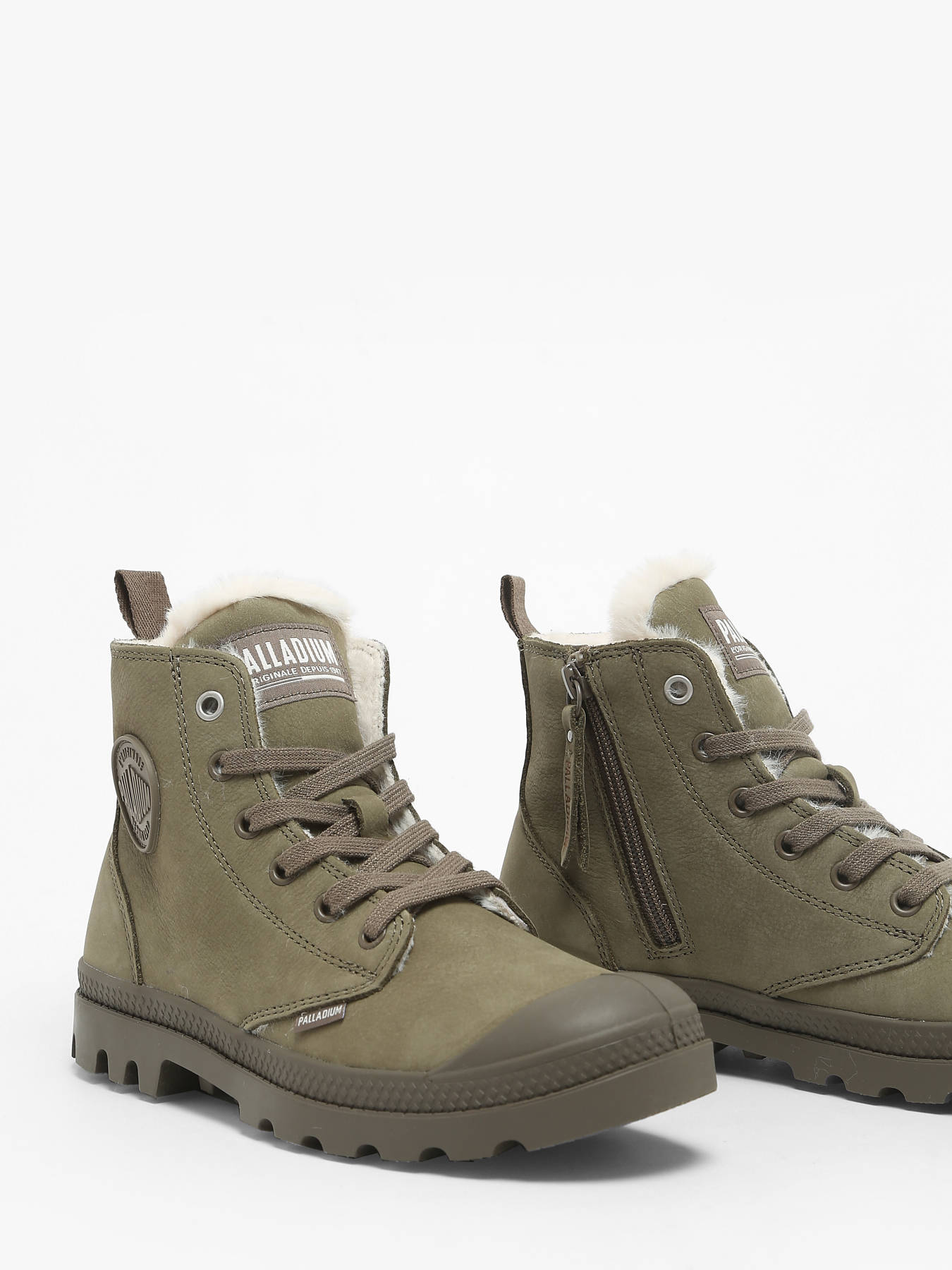 The PALLADIUM leather ankle boots are designed for comfort and style. Made from high-quality leather, they feature a textile lining and a textile insole for optimal comfort. The rubber outsole ensures good grip and enhanced durability. This model closes with laces for a customized fit and a side zipper for easy on-and-off. They fit true to size, and their casual style makes them perfect for everyday wear while maintaining an elegant touch.
