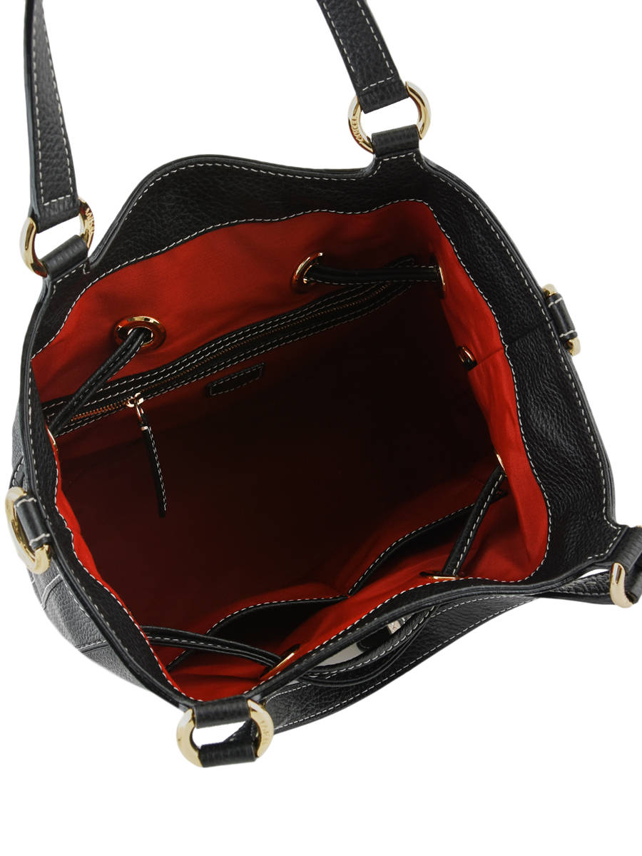 Vous pourrez fermer ce sac seau Premier Flirt de chez Lancel à l’aide d’un cordon en cuir décoré de pompons et le porter par les anses ou sur l’épaule en utilisant la bandoulière amovible.