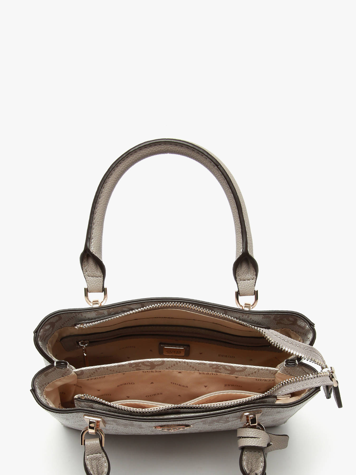 The NOELLE GUESS handbag, made of P.U., combines elegance and functionality for everyday use. The exterior features a secure zip closure and a practical back pocket for quick access to essentials. With a handle height of 10 cm, it can be comfortably carried by hand, while the adjustable and removable strap offers the option to wear it crossbody. Inside, the bag has two separate compartments, along with two simple pockets and one zippered pocket, perfect for organizing your belongings efficiently. The NOELLE GUESS is a versatile bag, ideal for combining style and practicality daily.