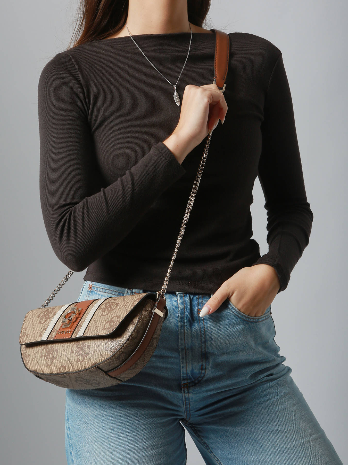 The Erenia Guess crossbody bag, crafted from durable coated canvas, combines elegance and practicality for a stylish everyday accessory. Its flap closure with magnet keeps belongings secure while allowing easy access. Wear it on the shoulder or as a crossbody with its adjustable strap, offering comfort and versatility to suit your needs. The exterior features a convenient back pocket for essentials within reach. Inside, one main compartment is complemented by three simple pockets for efficient organization of personal items. Compact yet functional, the Erenia impresses with its modern lines, refined finish, and chic urban appeal. Perfect for city days or casual outings, it becomes an essential accessory that blends style and practicality to enhance your outfit with elegance.