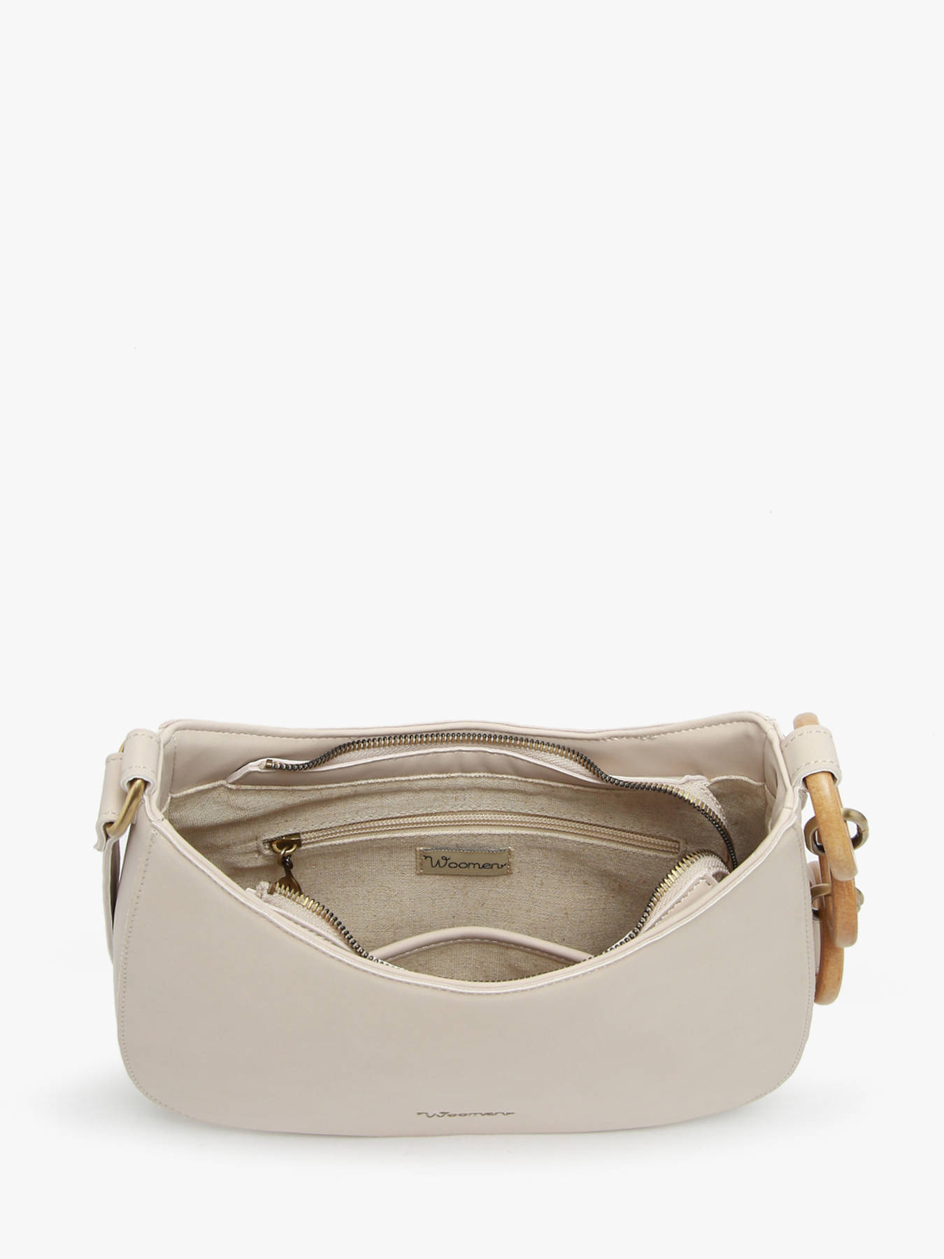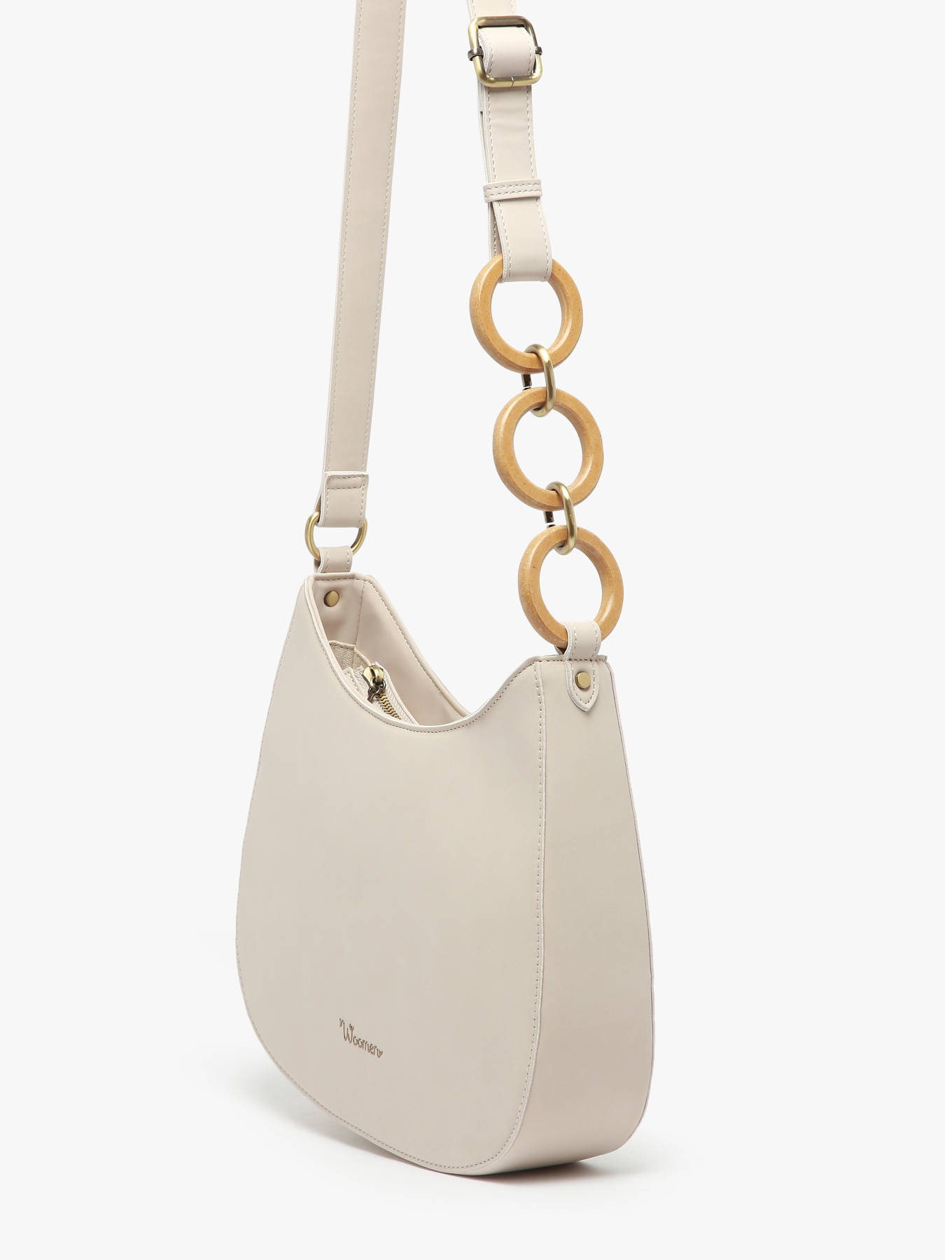 The WOOMEN shoulder bag from the HELICONIA line is made of polyurethane composed of 58% recycled materials, with a cotton and linen lining for added comfort. It closes with a zip fastening and features an adjustable shoulder strap adorned with interlaced rings. Inside, it offers a main compartment, a slip pocket, and a zip pocket, as well as a back pocket for convenient storage. Its elegant design is completed by a modern new logo.