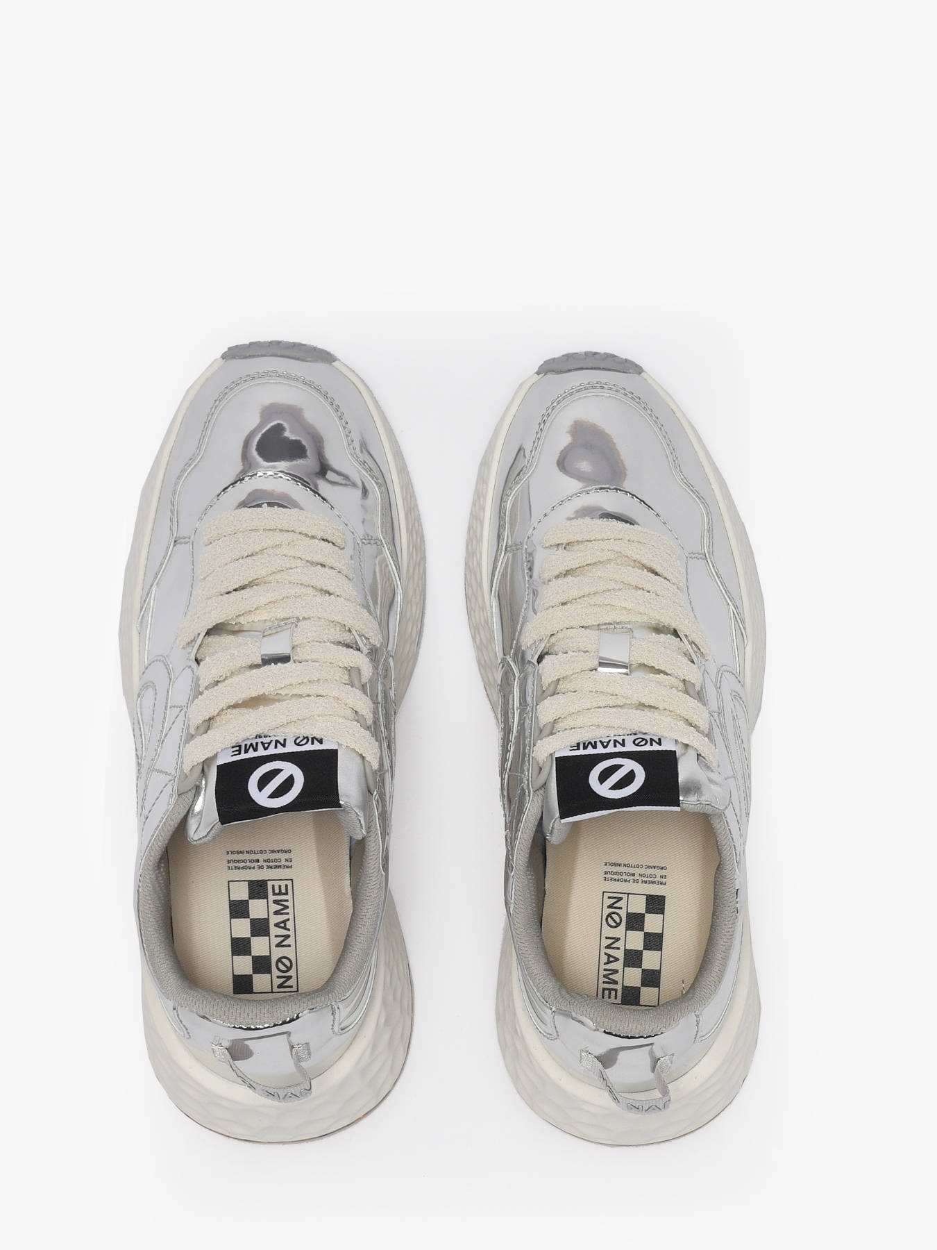The CARTER JOGGER by NO NAME, here in a silver version with removable charms, reinvents the brand’s iconic sneaker with a bold and eye-catching twist. This model combines GRS-certified recycled polyester with velvety suede leather, striking the perfect balance between responsible design and premium appeal. Its mirrored finish brightens up winter outfits, while the playful charms offer a customizable touch. The blend of materials delivers a refined, textured aesthetic ideal for a modern urban style. Comfortable, durable and fashion-forward, this silver CARTER JOGGER is the ultimate statement sneaker of the season, perfect for adding shine and personality to your everyday looks.