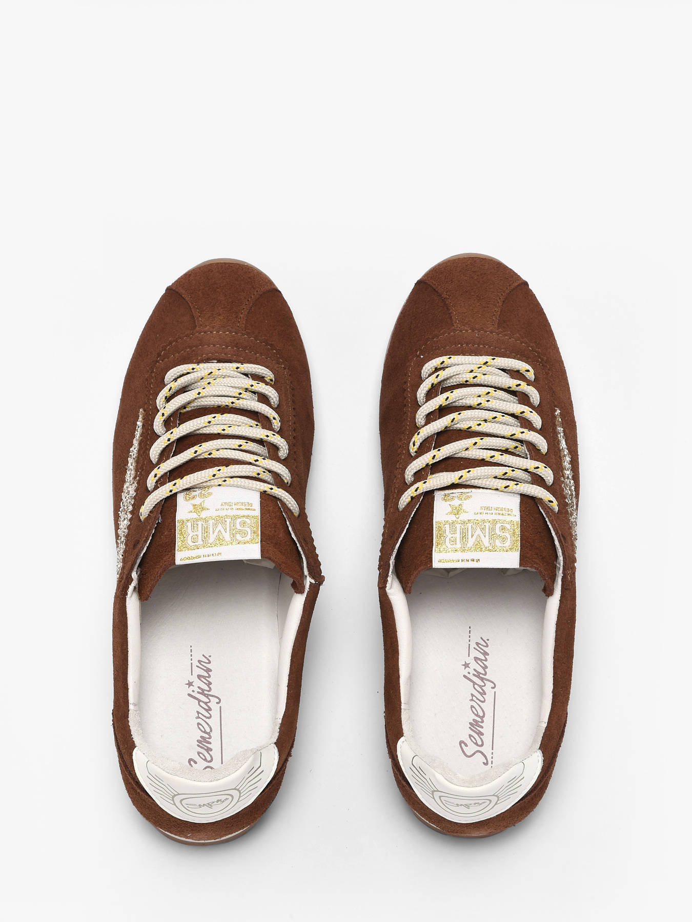 The Cassie sneakers from Semerdjian embrace warm, sophisticated tones for a chic, everyday urban look. Their brown suede leather upper provides comfort, durability, and support, while the suede base adds texture and modernity. The signature gold glitter lightning bolt energizes the design, bringing subtle sparkle to every step. Versatile and stylish, these sneakers are perfect for city wear or outings, offering support, comfort, and a refined design that turns heads. The Cassie perfectly embodies the balance between casual style and contemporary sophistication that defines Semerdjian.