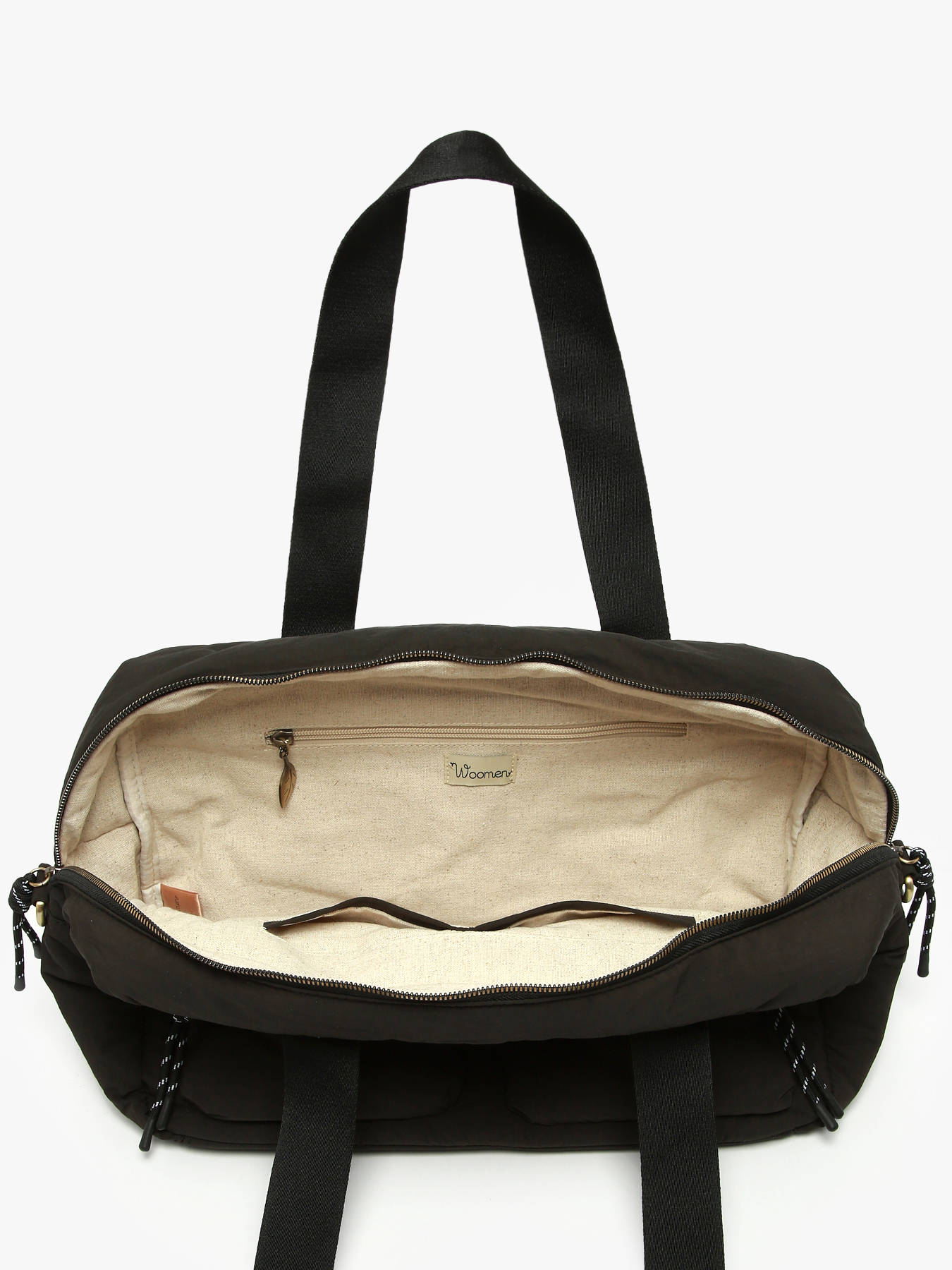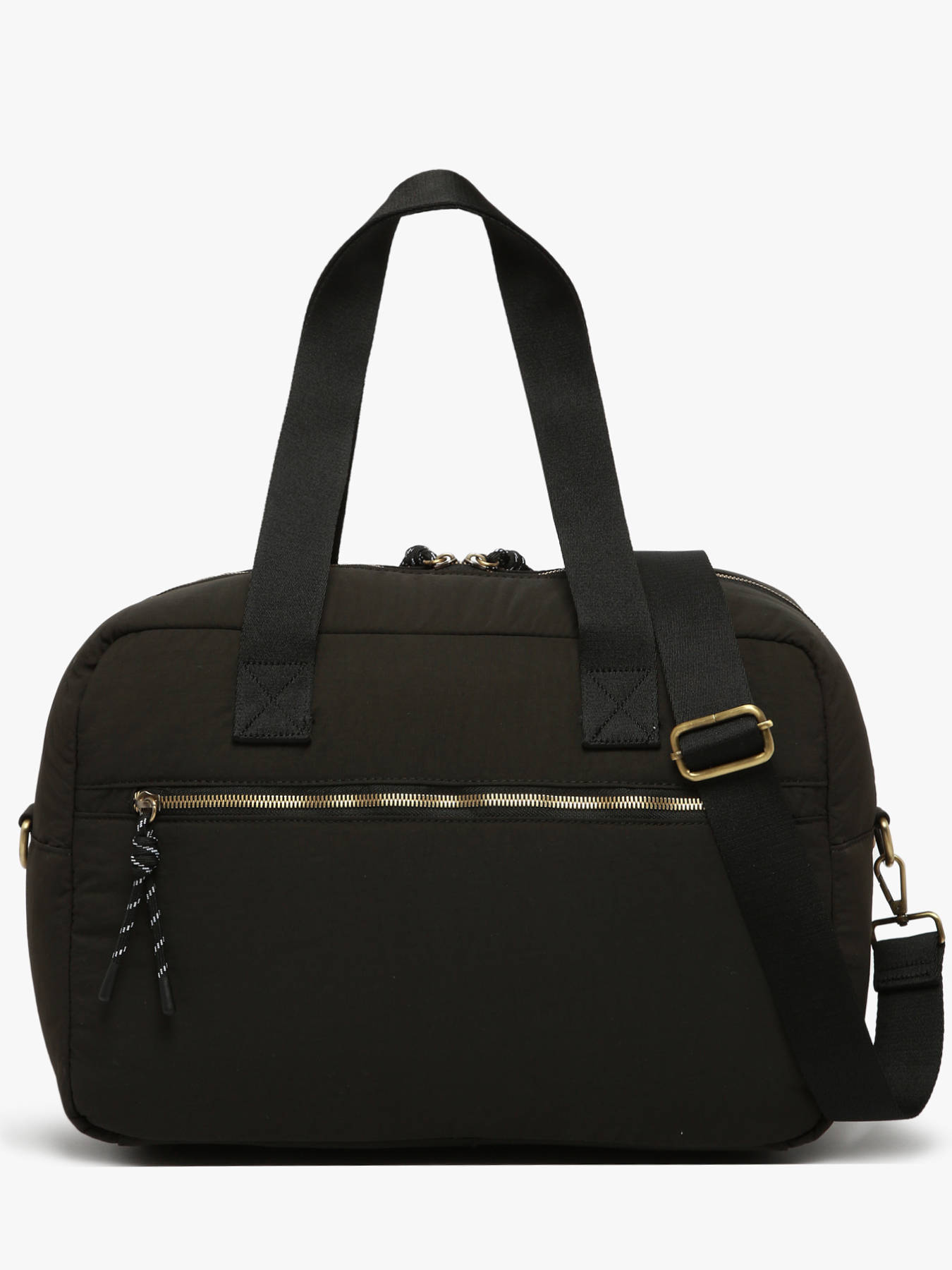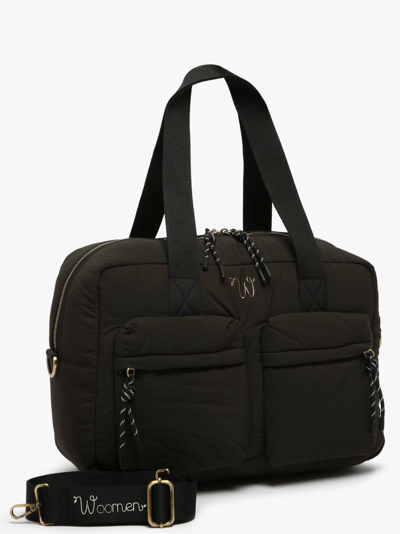 This WOOMEN weekend bag from the PRIMEVERE line, crafted from recycled nylon with a cotton and linen lining, combines practicality and elegance. It can be carried on the shoulder, crossbody, or by hand thanks to its integrated strap. Its functional exterior features two front pockets and a back pocket concealing a handle to attach it to luggage. The golden logo and decorative cords enhance this responsible accessory, designed to accompany your travels with style and efficiency.